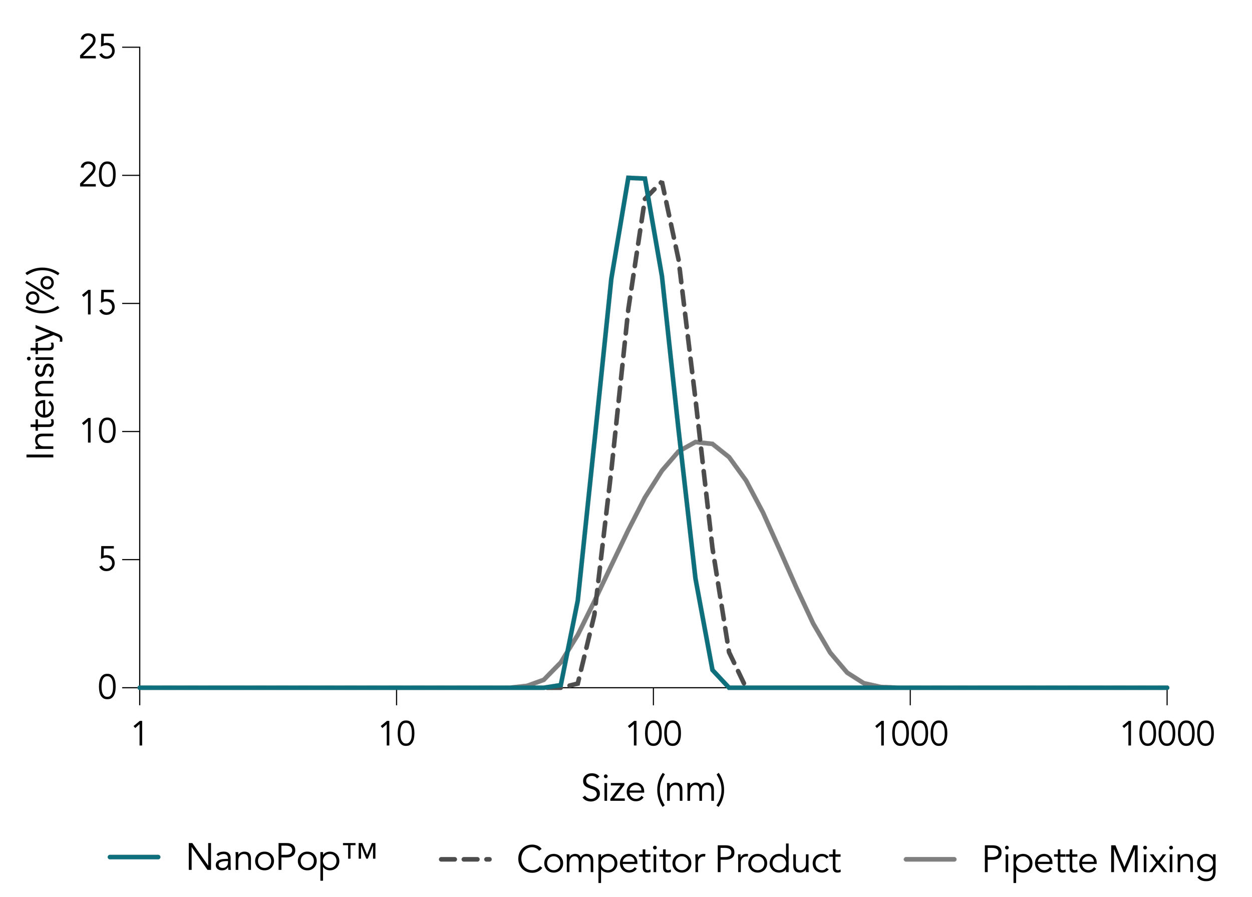 NanoPop™ works at the 3:1 nucleic acids to lipids volume ratio commonly used in microfluidics protocols (flow rate ratio, FRR = 3).